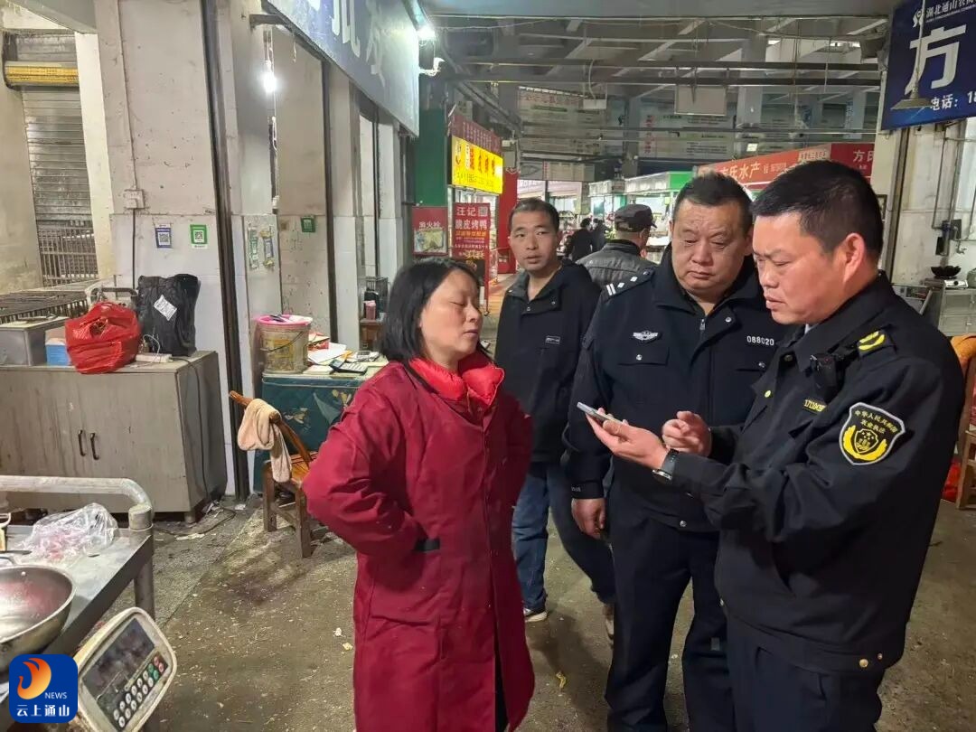 云上通山报道:进货凭证是否规范?储存温度是否达标?检疫票证是否齐全?4月2日,通山县公安局环食药侦大队联合县市场监督管理局、县农业农村局,在月亮湾农贸市场禽畜类产品专项检查中,对这些关键问题逐一查验。