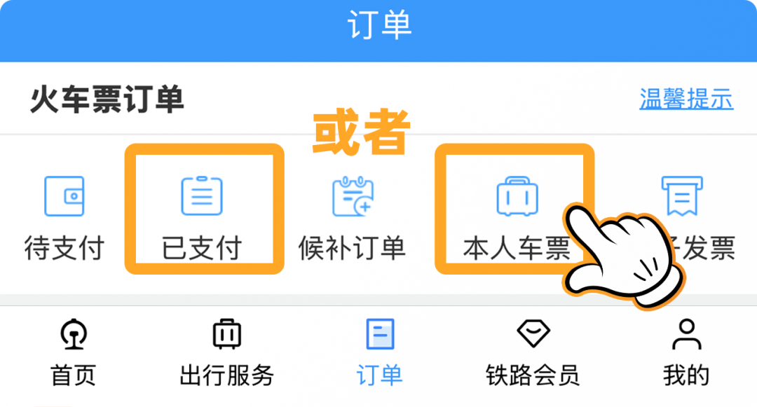成人旅客购票后,可以点击【订单】-【已支付】,也可以点击【本人车票】找到申报入口,点击【免费乘车儿童申报】添加免费乘车儿童即可。