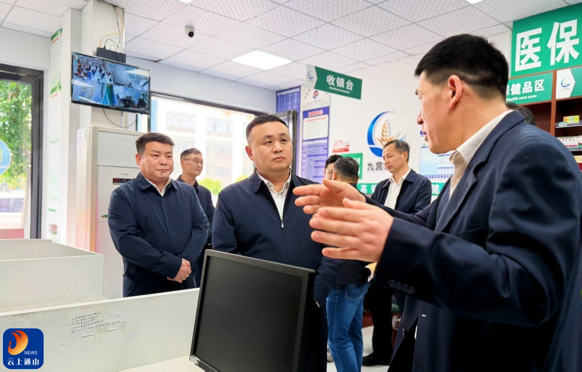 ▲在九宫药业大药房人民医院店,王功辉检查医保刷卡结算、处方核验、药品管理等工作。