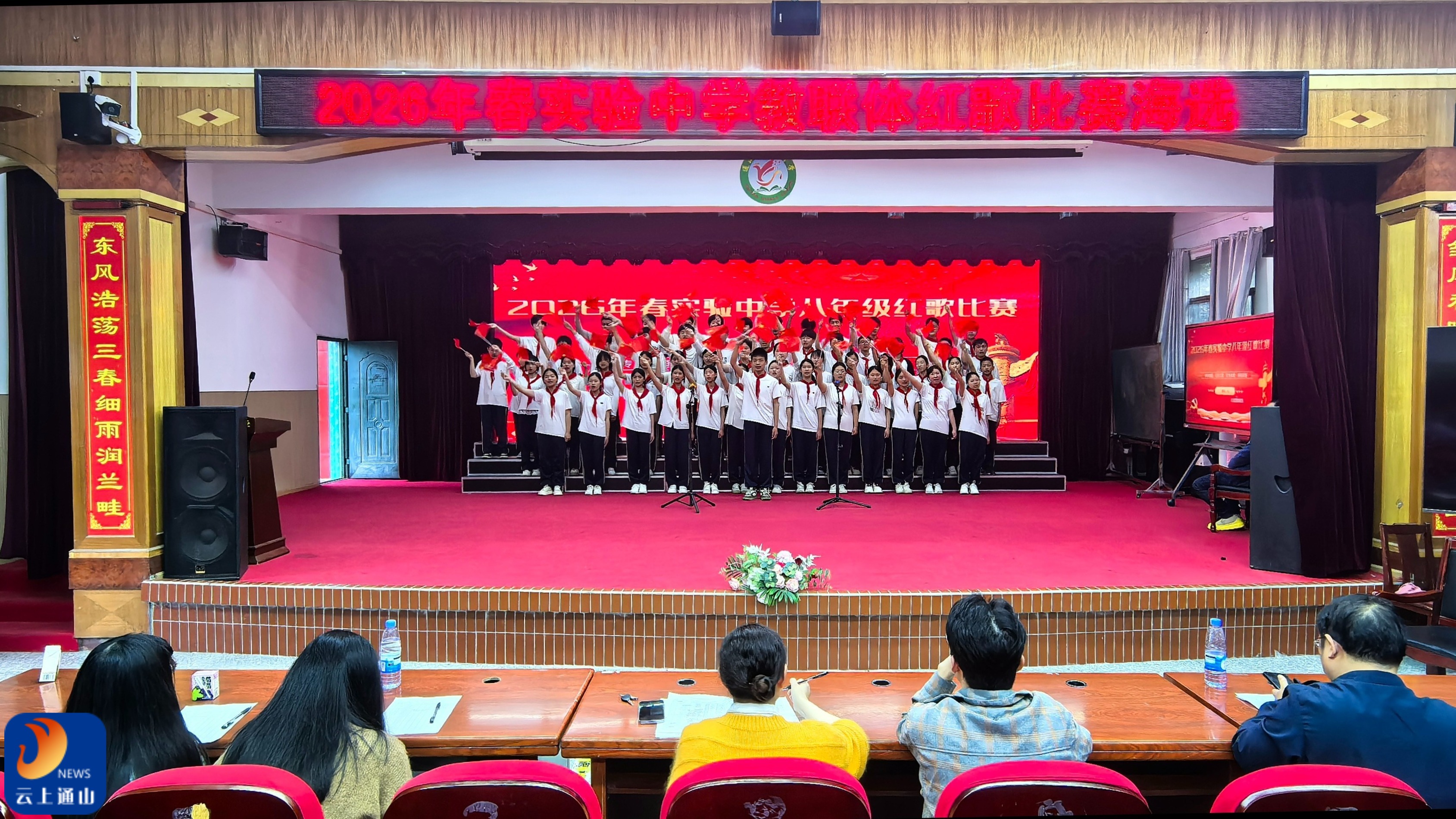 云上通山报道:(通讯员 阮婕)为传承红色基因、厚植爱国情怀,培育时代新人,4月16日,实验中学教联体以“红歌润初心 青春颂中华”为主题,精心组织实验中学和畈泥校区七、八年级全体学子开展红歌合唱海选活动,用嘹亮歌声致敬革命先辈,用青春旋律礼赞伟大祖国。