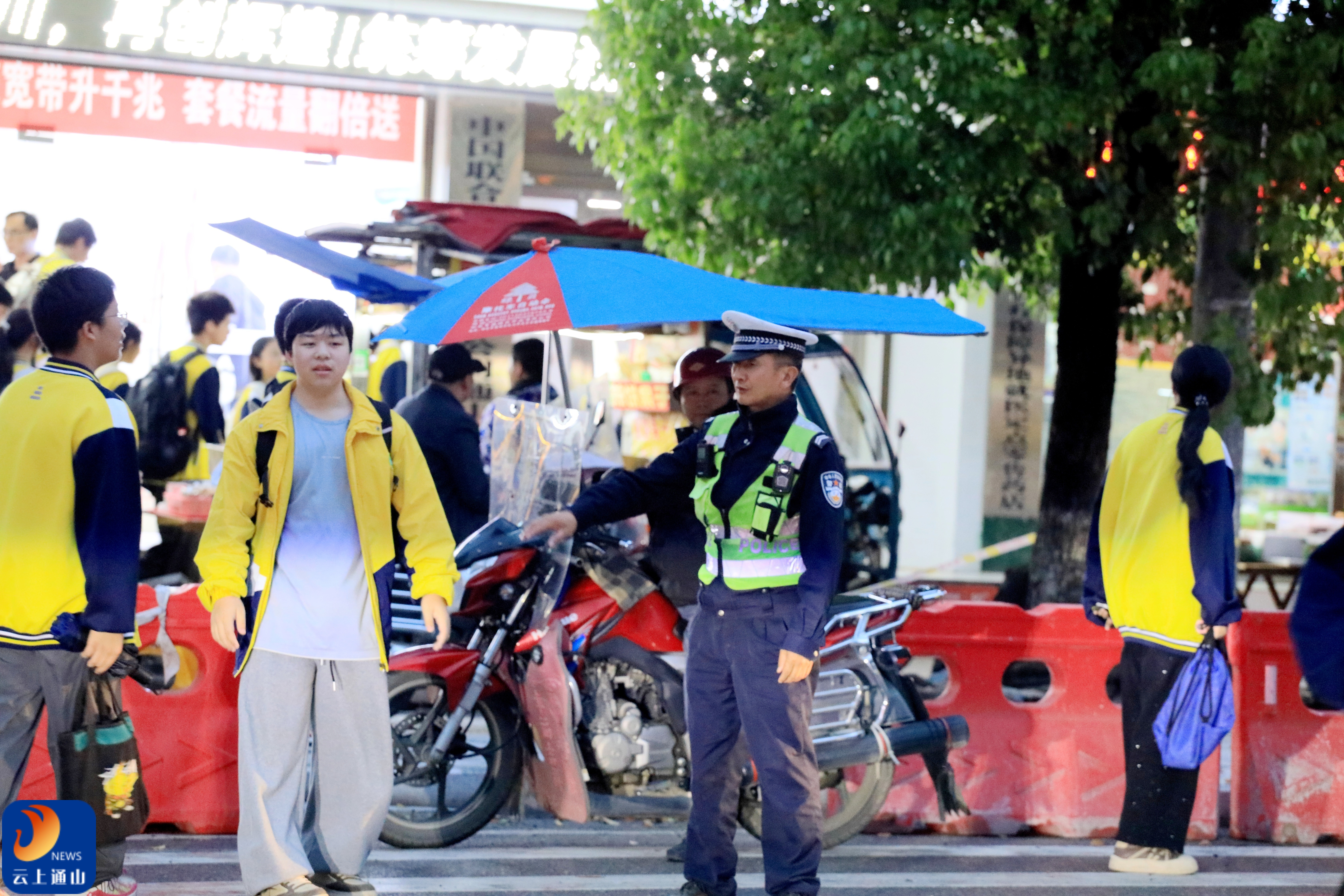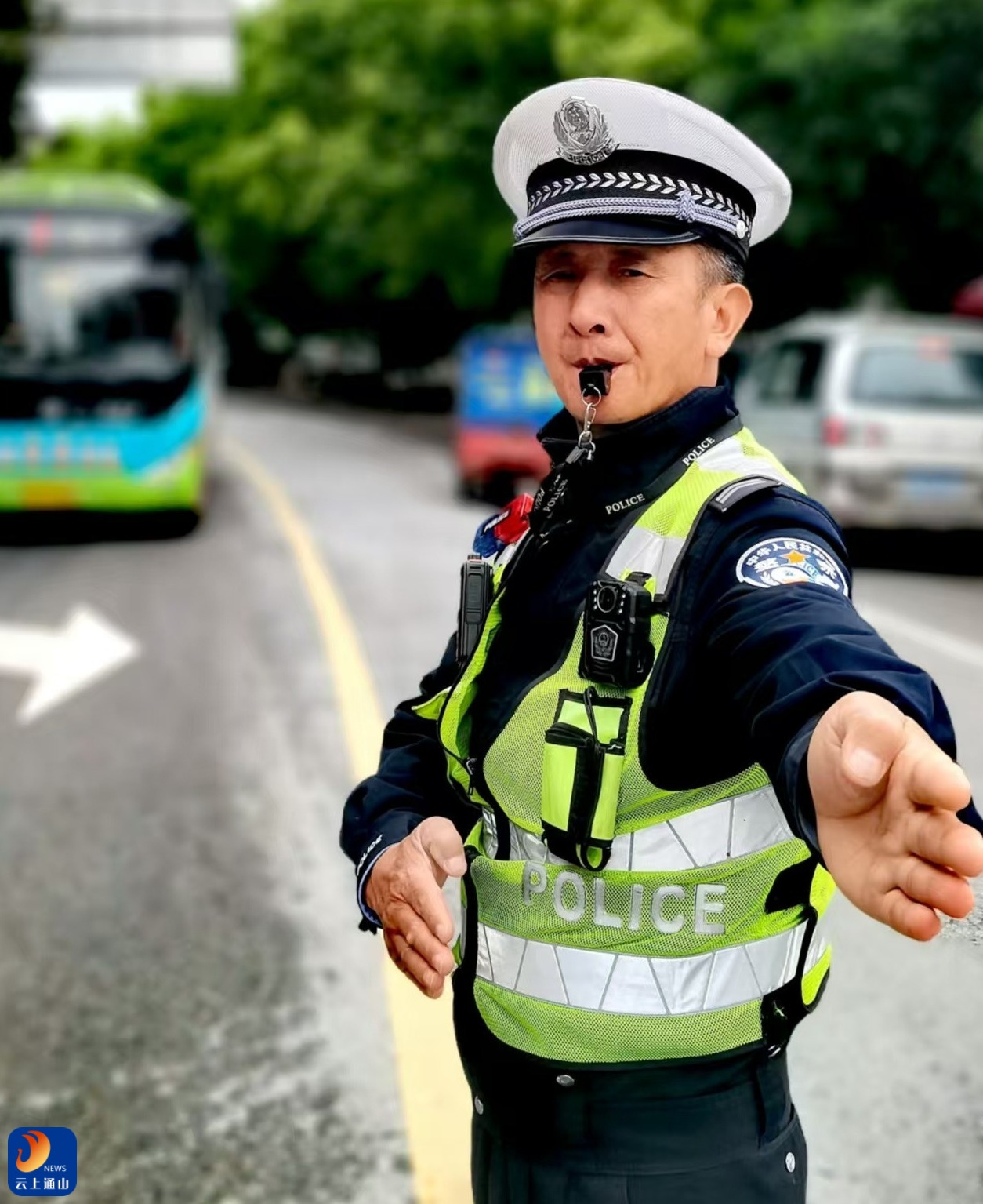 云上通山报道:(通讯员 柯国强)4月20日傍晚六点半,正是学校放学时间,通山县实验中学的路口准时热闹起来。护学交警老范站在路口斑马线旁,哨子一响,手臂一横,车流停住,孩子们像一群欢快的小鸟涌过马路。