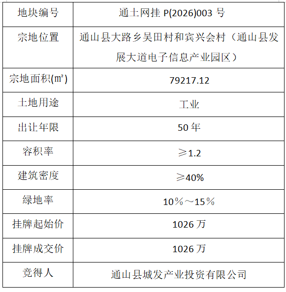 2026年4月22日,湖北省通山县通土网挂P(2026)003号地块国有建设用地使用权,在咸宁市自然资源和城乡建设网上交易系统交易成功,现将出让结果公告如下: