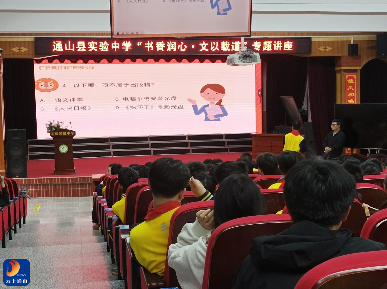 云上通山报道:(通讯员 孔深)为迎接世界读书日及世界知识产权日,进一步增强青少年尊重知识、崇尚创新、保护版权的意识,4月24日下午,通山县委宣传部携手县新闻出版局、县文旅局走进县实验中学,开展了以“全民阅读进校园 出版版权知多少”为主题的宣传教育活动,为师生们带来一堂生动的版权普法课。