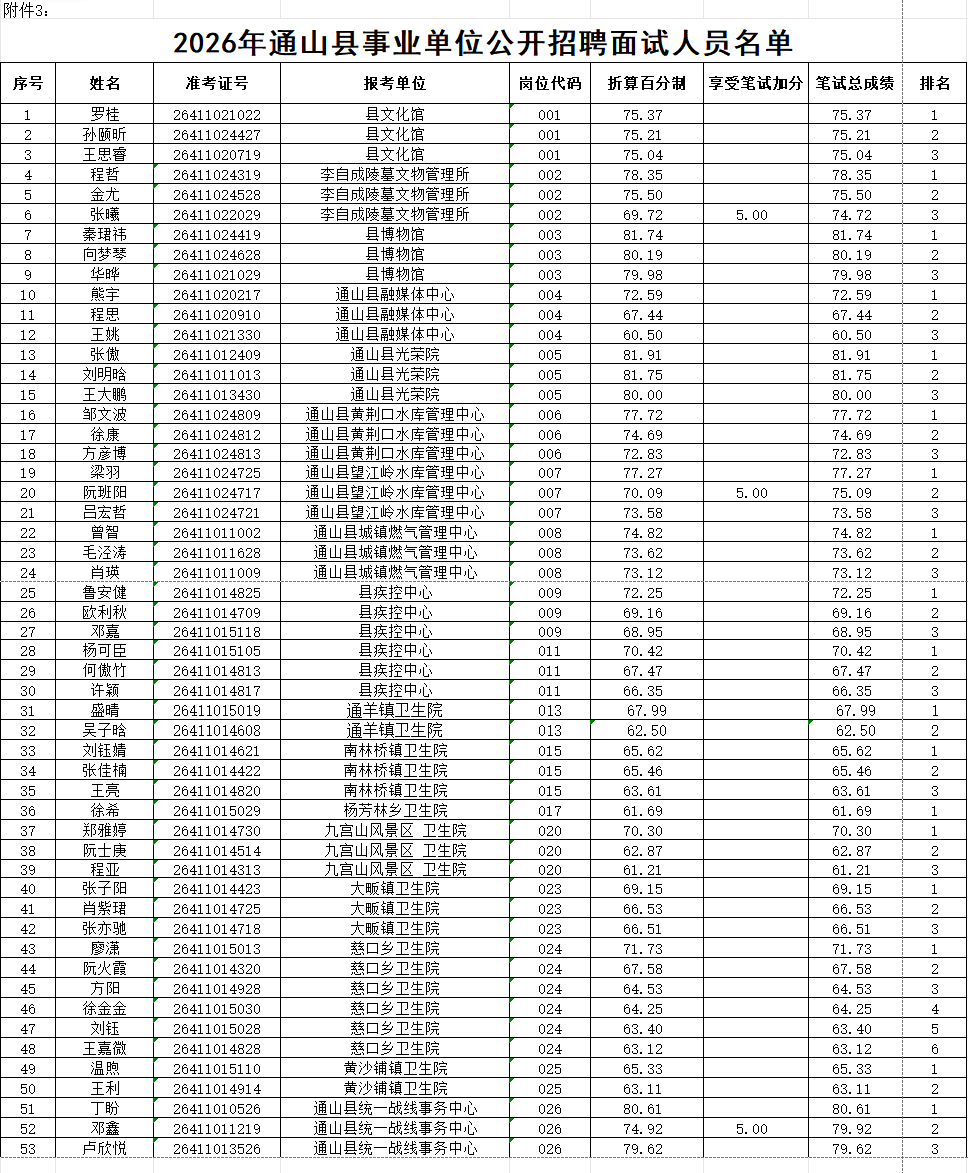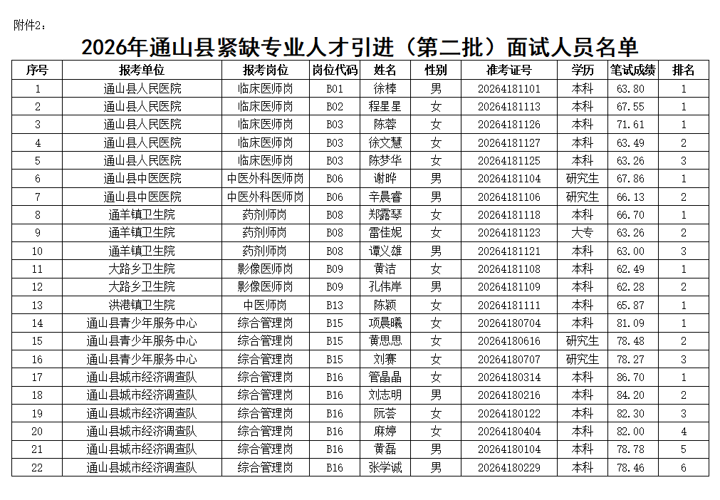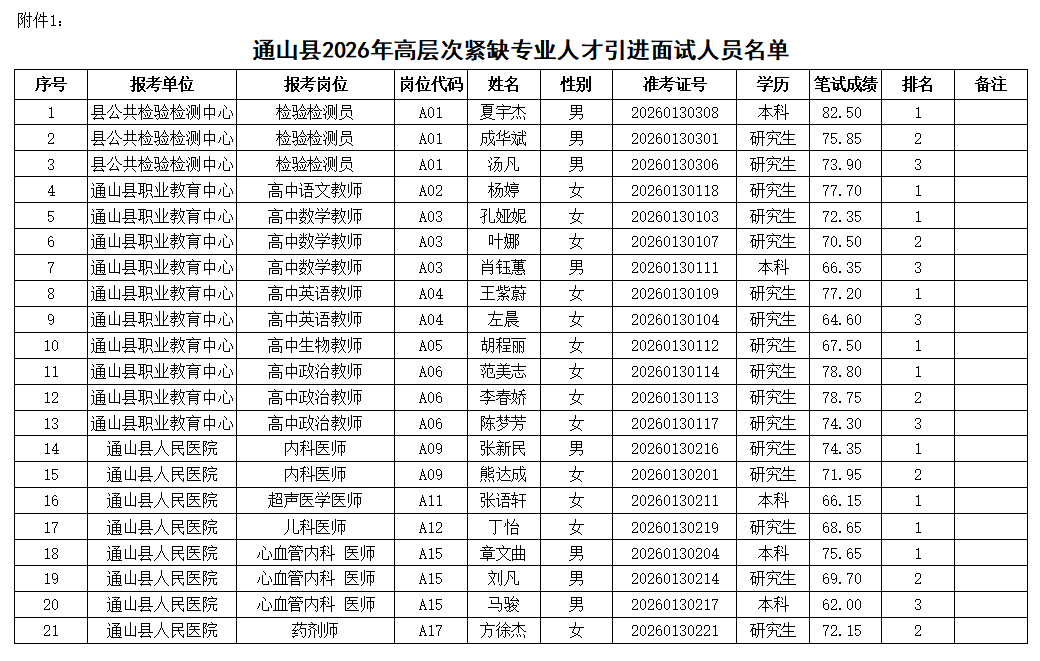 附件:1.通山县2026年高层次紧缺专业人才引进面试人员名单