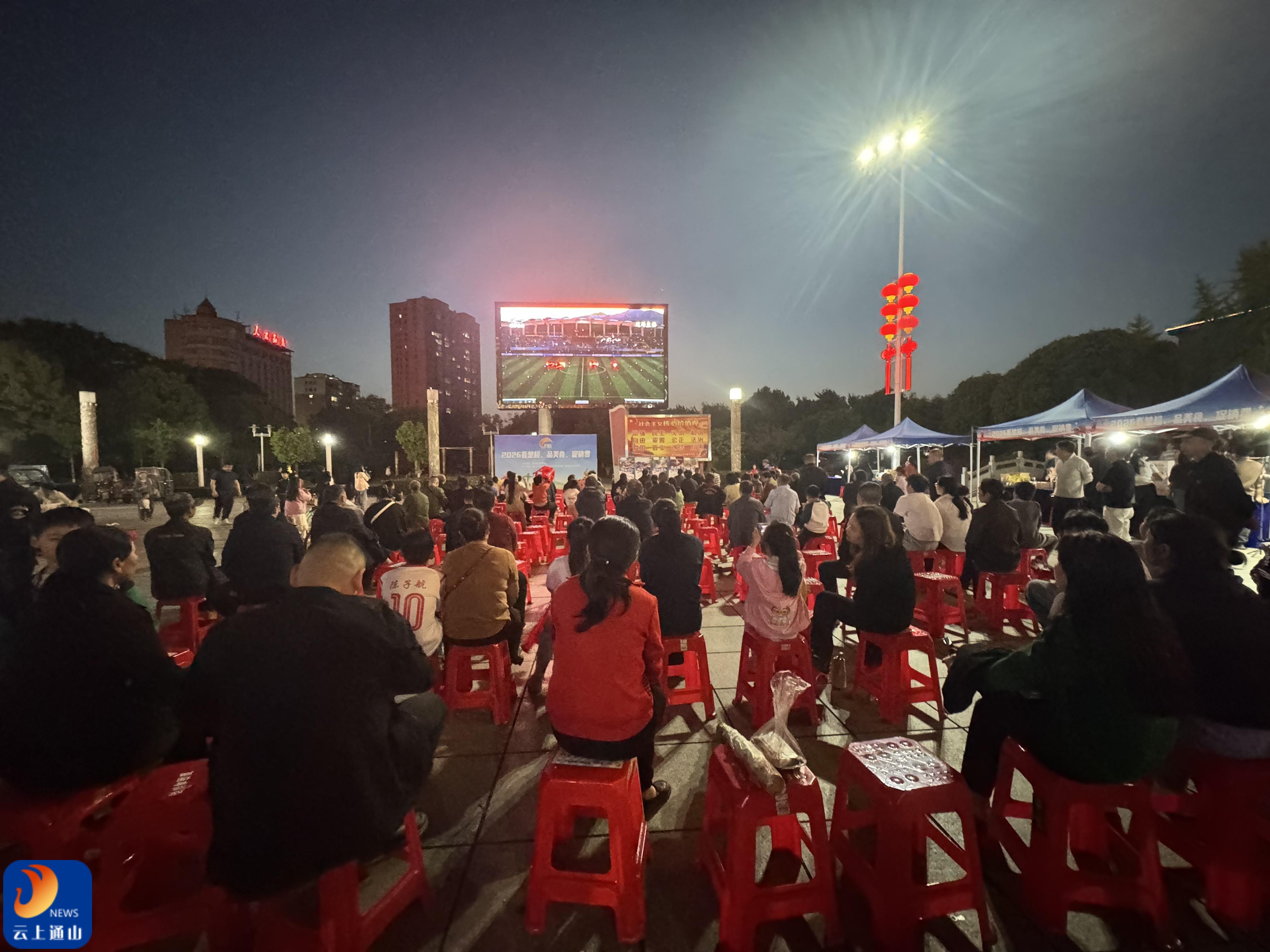 夜幕下,巨型 LED 大屏实时转播赛事,市民们或围坐或驻足,目光紧盯赛场每一次传球、射门,为咸宁队呐喊助威,掌声、欢呼声此起彼伏,初夏的夜晚充满活力与激情。大家在轻松惬意的氛围中共享赛事乐趣,感受家乡球队的拼搏风采。