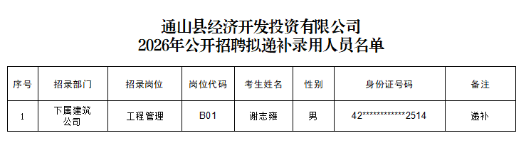 根据《通山县经济开发投资有限公司2026年公开招聘公告》及相关规定,经资格审查、笔试、面试、体检和考察等程序,工程管理岗(岗位代码:B01)因故出现空缺1名。经研究,决定依据该岗位考生综合成绩排名进行递补。现将拟递补录用人员名单予以公示(详见附件),公示时间为5个工作日。