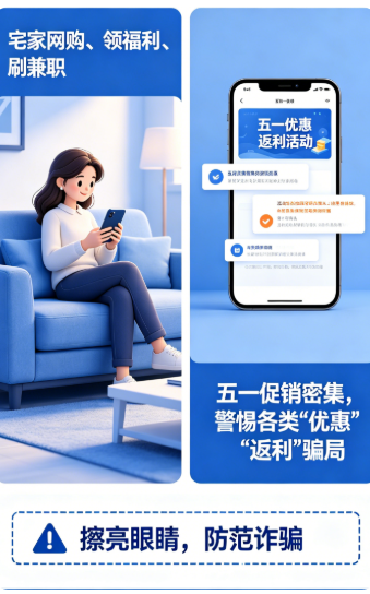 尤其是五一期间电商促销密集,各类“优惠”“返利”信息层出不穷,一定要擦亮眼睛!
