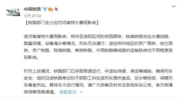 中国铁路微博发布:受河南省特大暴雨影响,郑州至洛阳区间的郑西高铁、陇海铁路发生水漫线路、路基坍塌、设备淹水等情况,列车无法通行;途经郑州地区的京广高铁、徐兰高铁、京广铁路、陇海铁路、焦柳铁路、宁西铁路等线路的运输秩序均不同程度受到影响。