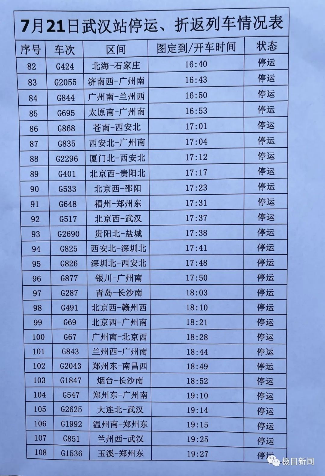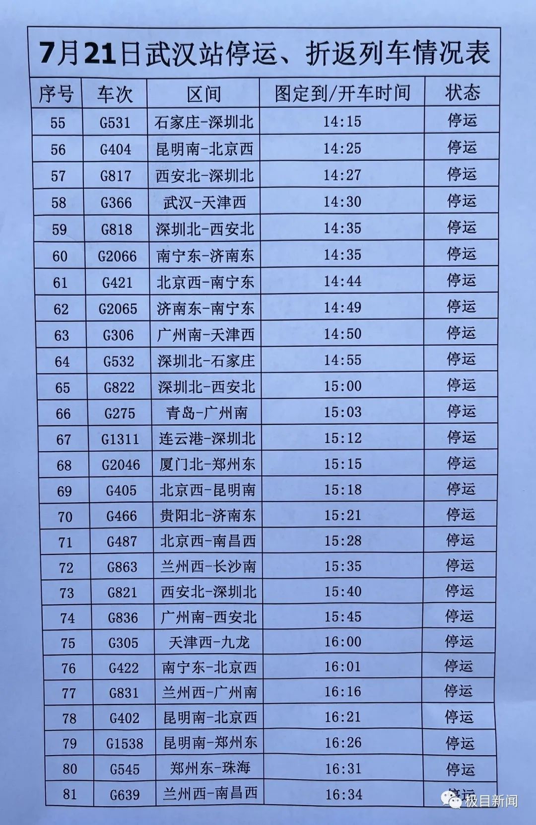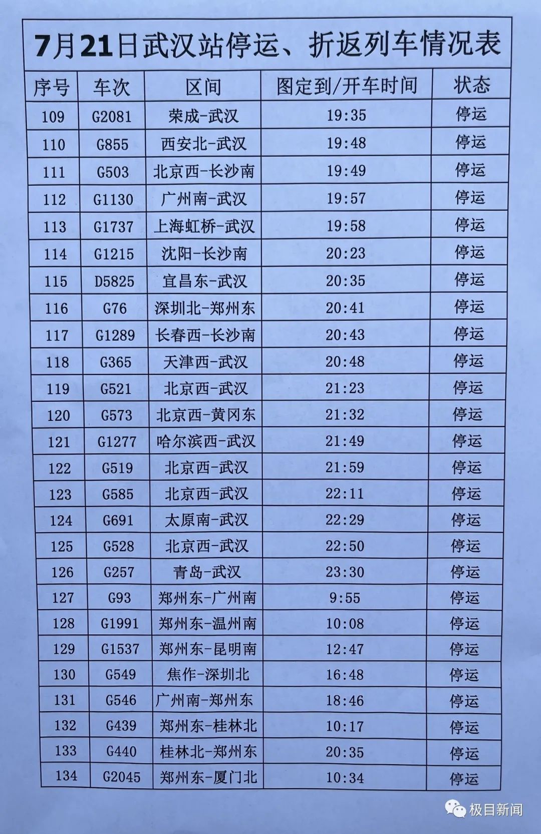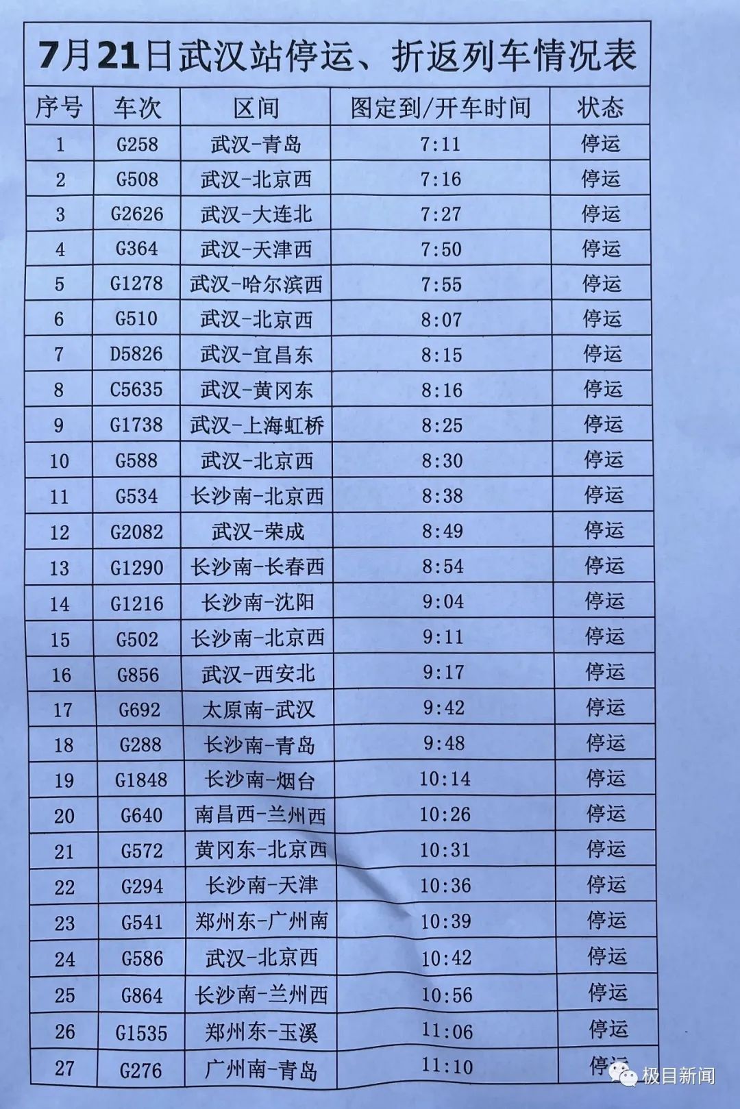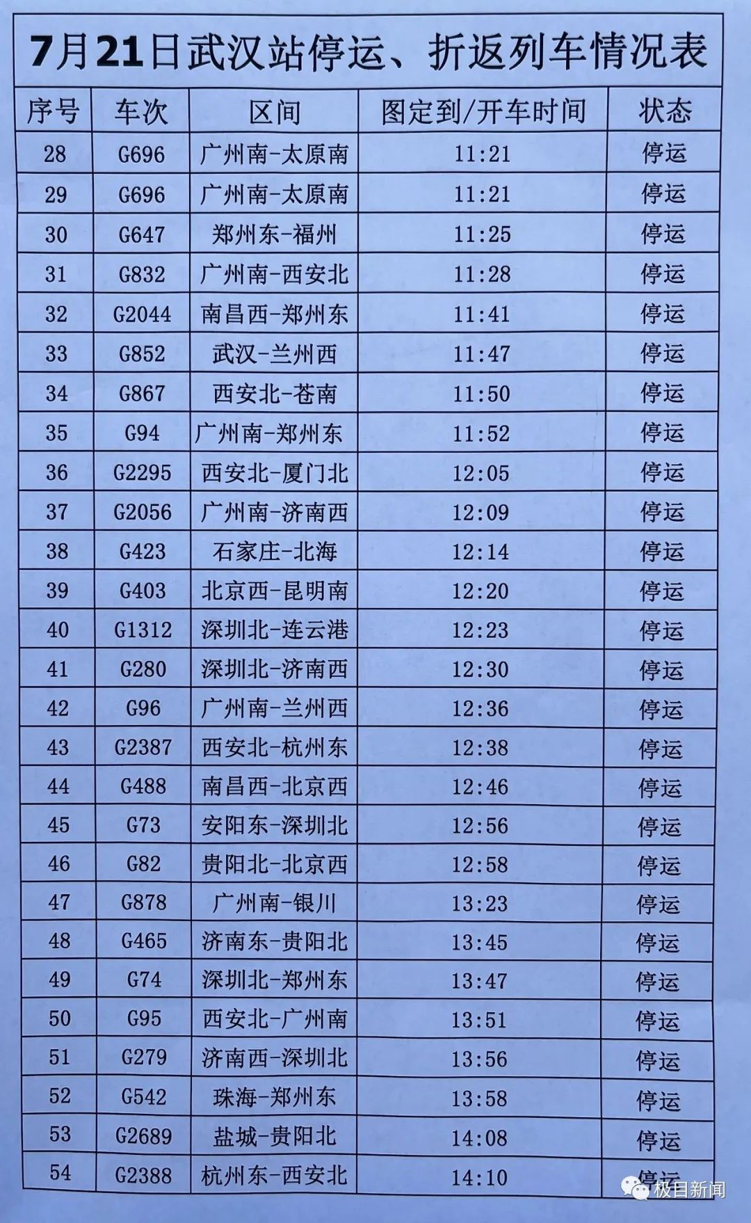 武汉站工作人员在售票处张贴了7月21日武汉站停运和折返的具体列车车次。具体如下: