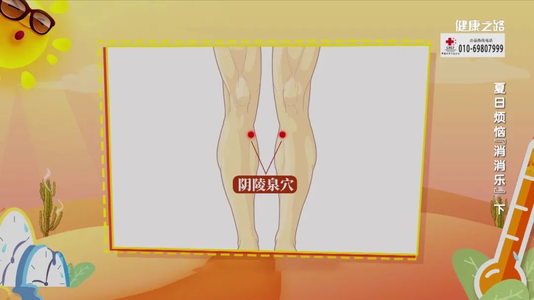 按压腿部的阴陵泉穴可以起到健脾利湿的作用。揉十下推一下,连续做十次,双腿都要做。