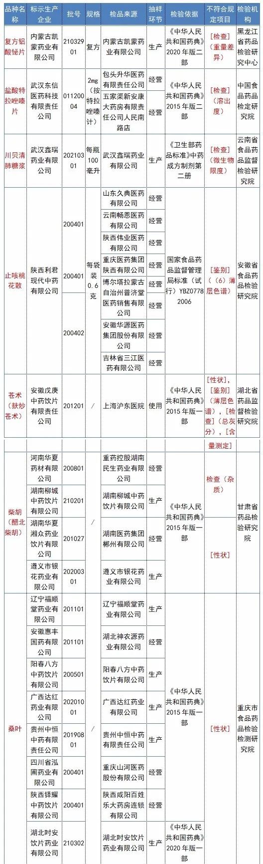 经重庆市食品药品检验检测研究院检验,标示为辽宁福顺堂药业有限公司、安徽惠丰国药有限公司、湖北时安饮片药业有限公司、阳春八方中药饮片有限公司、广西达红药业有限公司、四川省泓圃药业有限公司、贵州中恒中药有限责任公司、陕西铎耀中药饮片有限公司生产的8批次桑叶不符合规定,不符合规定项目为性状。