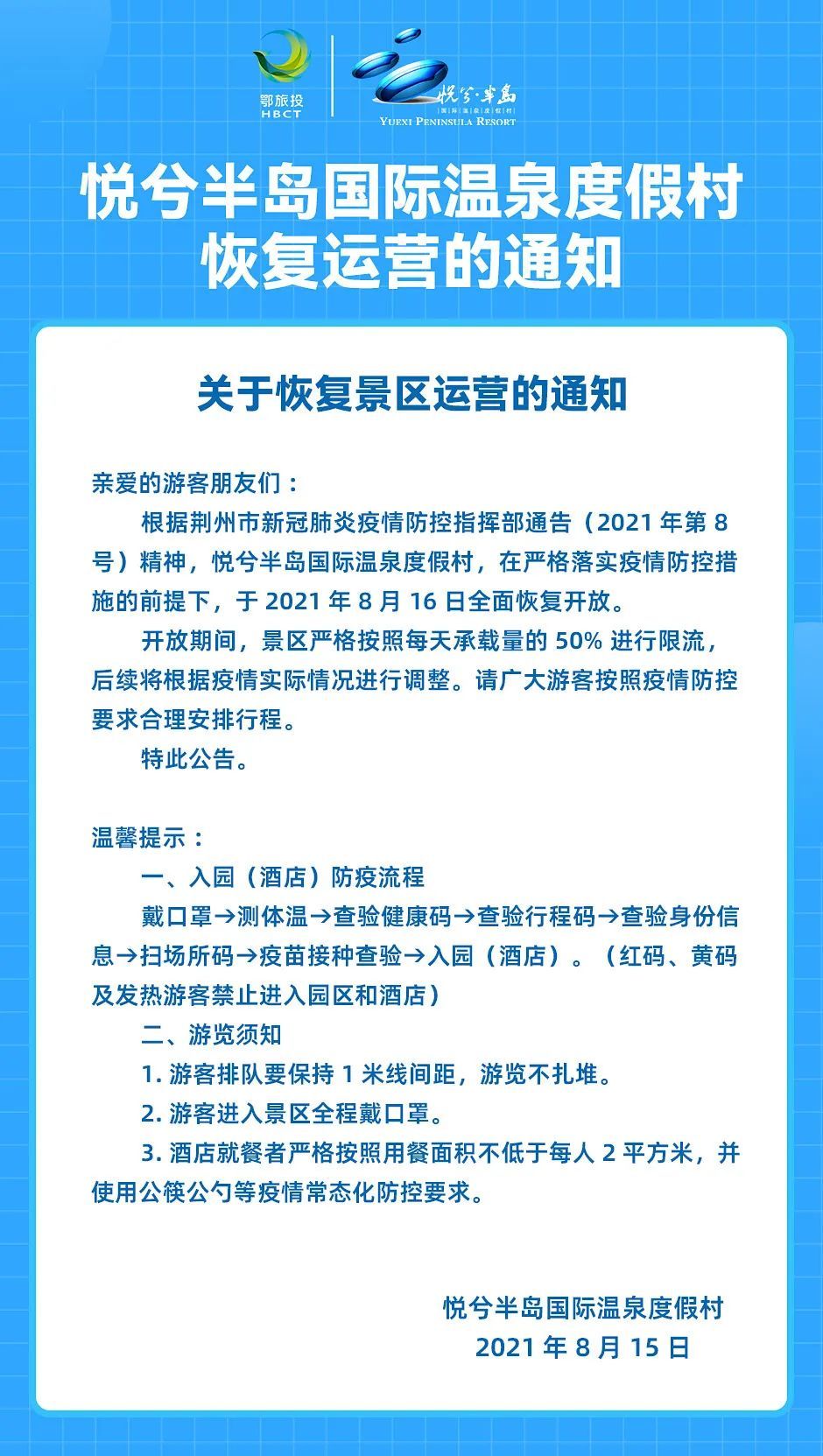 根据荆州市新冠肺炎疫情防控指挥部通告(2021年第8号)精神,洈水景区在严格落实疫情防控措施的前提下,于2021年8月16日7:00恢复对外开放。百岛画廊开放时间为9:00—16:00;汽车露营地开放时间为9:00—17:00。请入园游客遵守景区相关规定,配合做好疫情防控工作,文明旅游,有序游览。