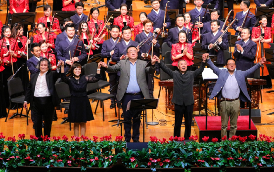 图为指挥家汤沐海、作曲家王丹红、郝维亚、张千一、郭文景演出谢幕(由左至右)。中央民族乐团 供图