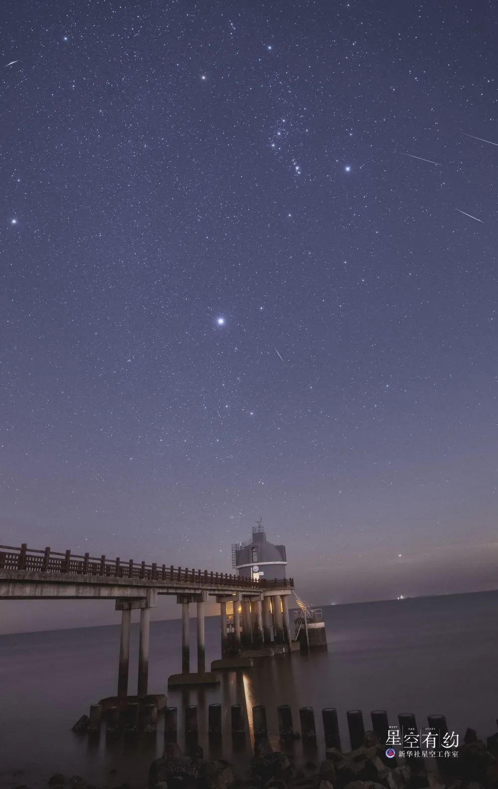 上海市天文摄影爱好者王鑫2020年10月24日在上海市奉贤区水文站拍摄到的猎户座流星雨(多张叠加)。(本人供图)