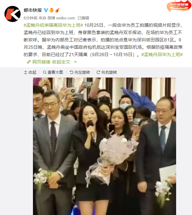 10月25日,一段由华为员工拍摄的视频片段显示,孟晚舟已经回到华为上班,身穿黑色套装的孟晚舟双手挥动,在场的华为员工不断欢呼。
