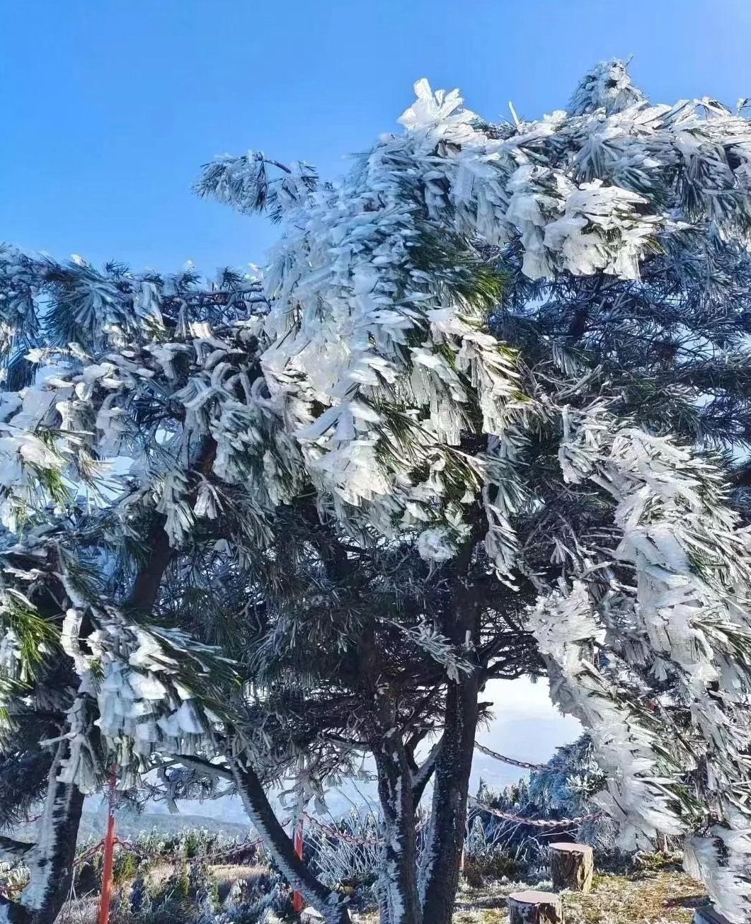 11月7日(立冬),受较强冷空气影响,九宫山铜鼓包却呈现出千树万树银花开的景象,雾凇处处可见洁白晶莹的冰花缀满枝头,形成了奇特的雾凇景观。