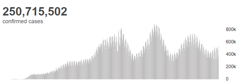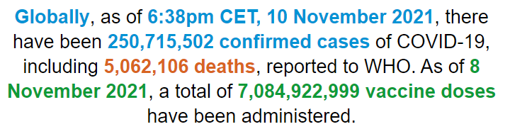 根据世卫组织最新实时统计数据,截至欧洲中部时间11月10日18时38分(北京时间11月11日1时38分),全球累计新冠肺炎确诊病例250715502例,累计死亡病例5062106例。10日全球新冠肺炎确诊病例新增536060例,死亡病例新增7636例。