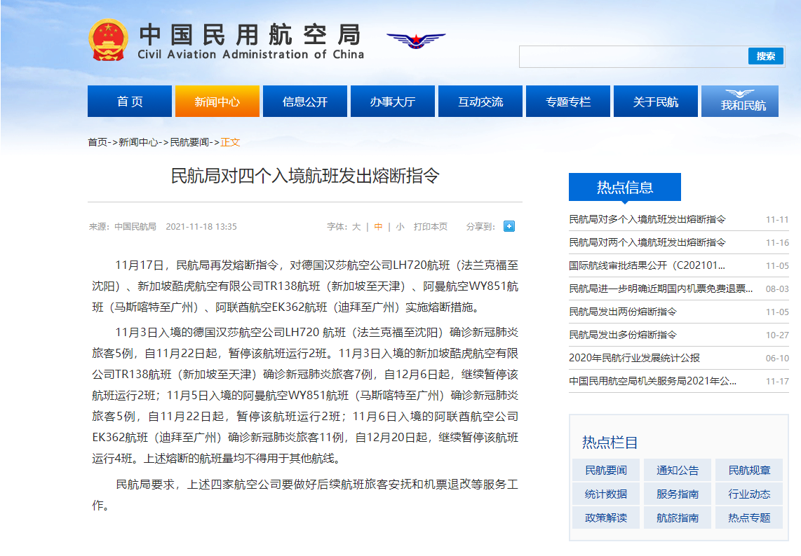 11月17日,民航局再发熔断指令,对德国汉莎航空公司LH720航班(法兰克福至沈阳)、新加坡酷虎航空有限公司TR138航班(新加坡至天津)、阿曼航空WY851航班(马斯喀特至广州)、阿联酋航空EK362航班(迪拜至广州)实施熔断措施。