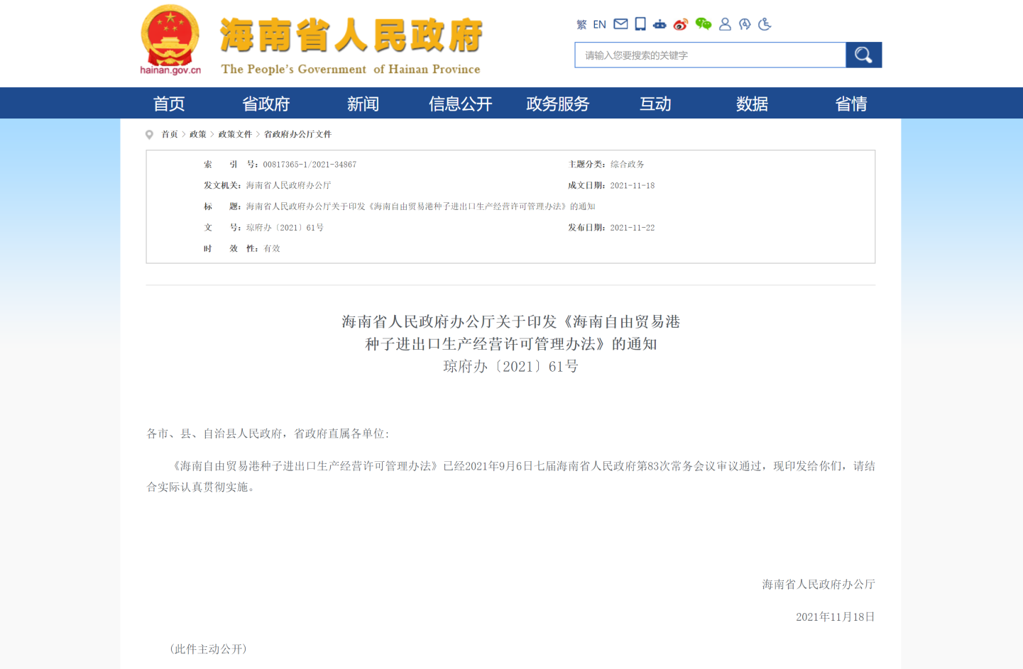 记者从海南省人民政府网站获悉,海南省人民政府办公厅近日印发《海南自由贸易港种子进出口生产经营许可管理办法》,在海南自由贸易港注册并从事种子进出口业务的企业,其种子生产经营许可证的申请、核发、监督管理等活动,适用本办法。本办法自2021年12月20日起实施。