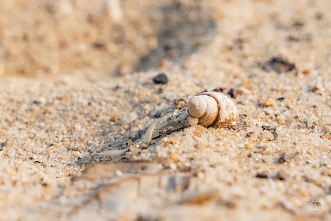 沙滩上有一层密密的螺壳,已经被水冲刷得发白,加上周围的山石,俨然一处无人荒岛。