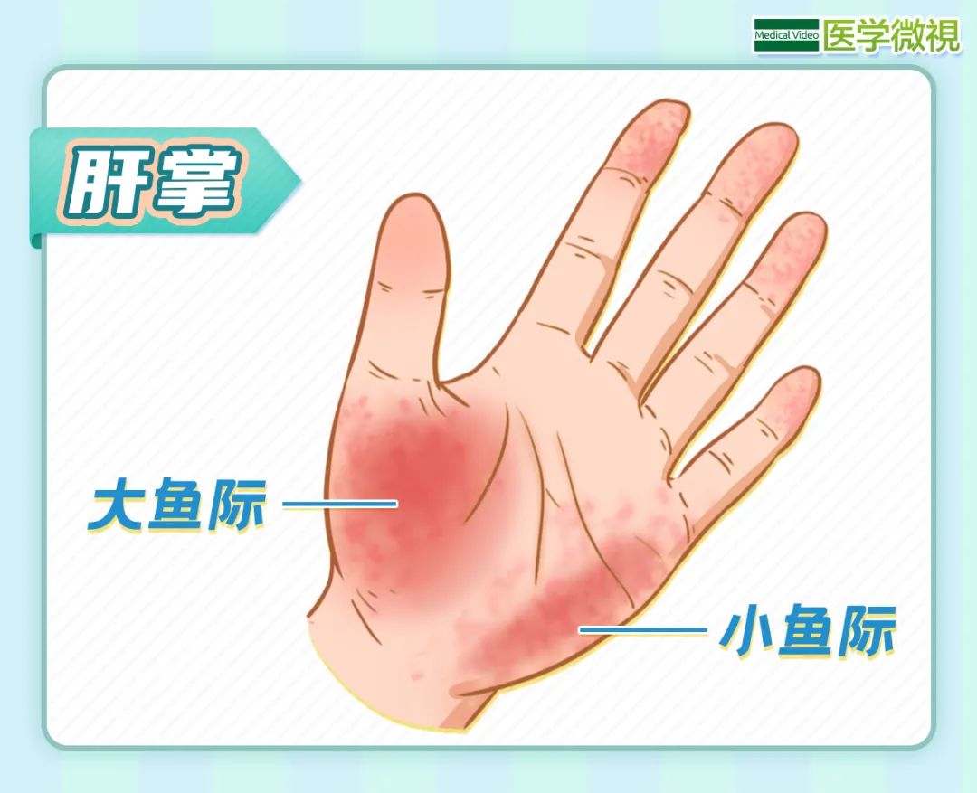 肝掌表现为手掌大鱼际、小鱼际的皮肤,出现粉红色或红色斑块、斑点,按压时颜色变淡。