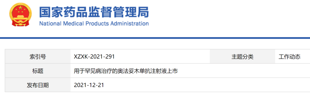 用于罕见病治疗的奥法妥木单抗注射液上市
