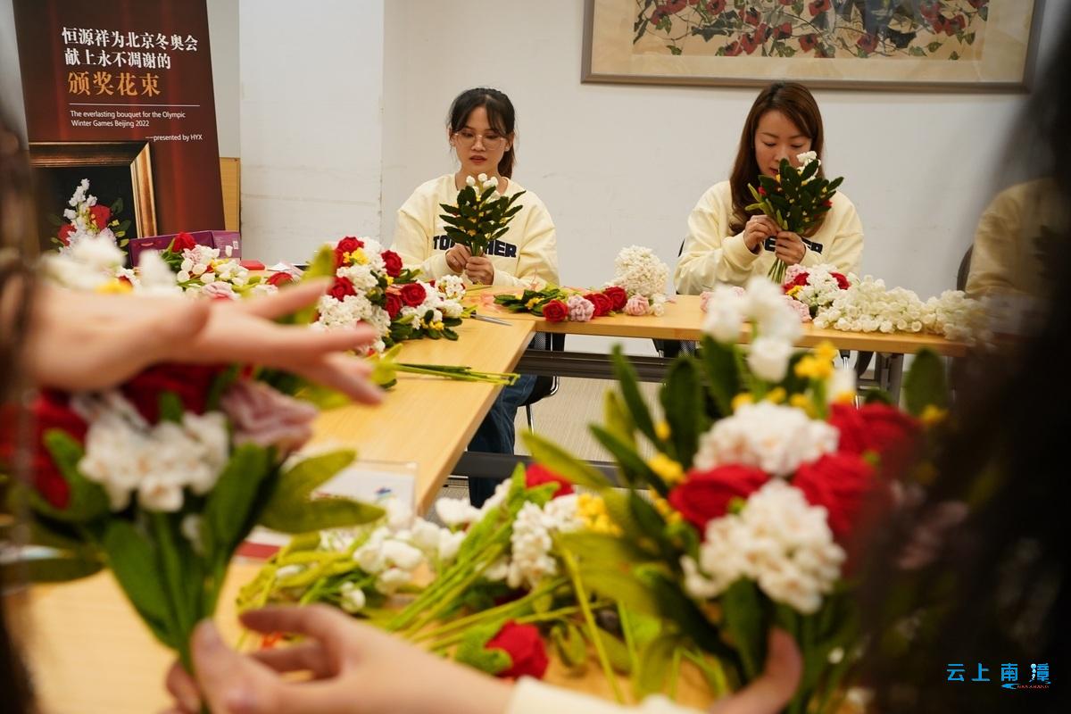 1月5日,志愿者组装北京冬奥会颁奖花束。(中国日报记者 高尔强 摄)