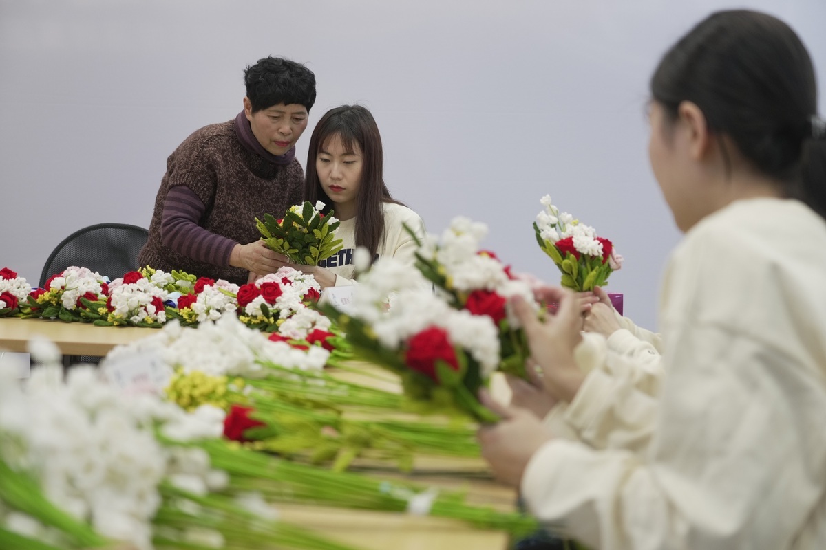 1月5日,“海派绒线编织技艺”上海市级代表性传承人励美丽(左一)指导志愿者组装北京冬奥会颁奖花束。(中国日报记者 高尔强 摄)
