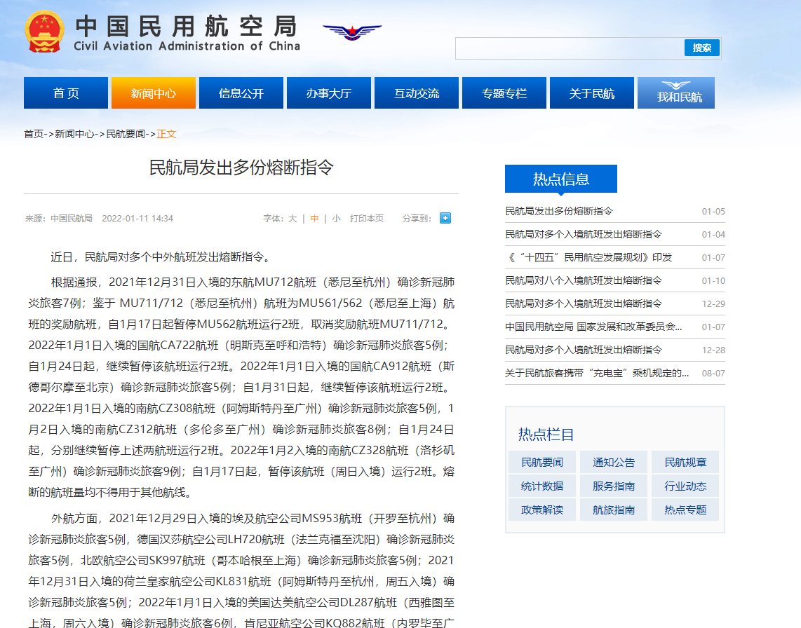 外航方面,2021年12月29日入境的埃及航空公司MS953航班(开罗至杭州)确诊新冠肺炎旅客5例,德国汉莎航空公司LH720航班(法兰克福至沈阳)确诊新冠肺炎旅客5例,北欧航空公司SK997航班(哥本哈根至上海)确诊新冠肺炎旅客5例;2021年12月31日入境的荷兰皇家航空公司KL831航班(阿姆斯特丹至杭州,周五入境)确诊新冠肺炎旅客5例;2022年1月1日入境的美国达美航空公司DL287航班(西雅图至上海,周六入境)确诊新冠肺炎旅客6例,肯尼亚航空公司KQ882航班(内罗毕至广州)确诊新冠肺炎旅客5例,美国联合航空公司UA857航班(旧金山至上海,周六入境)确诊新冠肺炎旅客6例,1月2日入境的美国达美航空公司DL283航班(底特律至上海,周日入境)确诊新冠肺炎旅客5例;自1月17日起,分别暂停上述8个航班运行2班。2021年12月31日美国航空AA127班(达拉斯至上海)确诊新冠肺炎旅客10例;自1月24日起,继续暂停该航班(周五入境)运行4班。2021年12月31日入境的意大利勒奥斯航空公司NO946航班(米兰至天津)确诊新冠肺炎旅客7例;自1月24日起,继续暂停该航班运行2班。2022年1月5日入境的德国汉莎航空公司LH720航班(法兰克福至沈阳)确诊新冠肺炎旅客11例;自1月31日起,继续暂停该航班运行4班。2022年1月6日入境的美国达美航空公司DL287航班(西雅图至上海)确诊新冠肺炎旅客11例;自1月24日起,暂停该航班(周四入境)运行4班。熔断的航班量均不得用于其他航线。