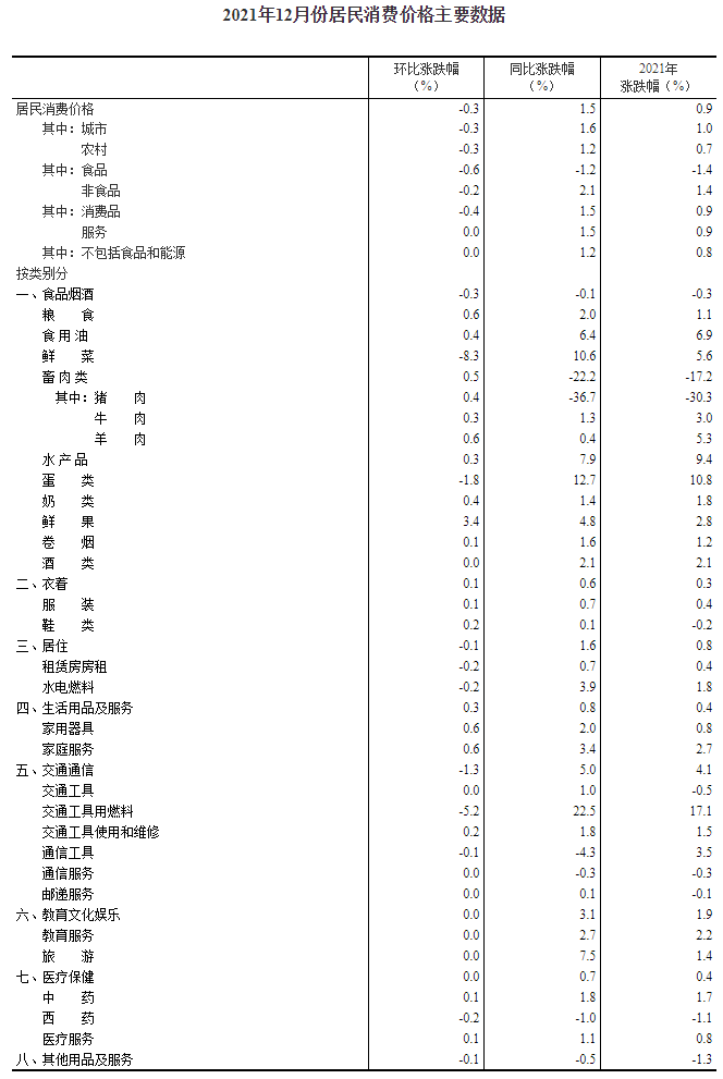 国家统计局今日发布数据显示,2021年全年,全国居民消费价格比上年上涨0.9%,低于涨幅3%左右的全年预期目标。