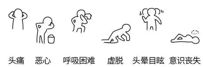 一氧化碳中毒的主要表现为头痛、头晕、恶心、呕吐、软弱无力,部分患者会迅速发生抽筋、昏迷症状,如救治不及时,会因呼吸抑制而死亡。