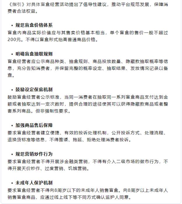 同时《指引》建议,规范盲盒价格体系。提出盲盒内商品实际价值应与其售卖价格基本相当,单个盲盒的售价一般不超过200元。不得以盲盒形式抬高普通商品价格。并建议明确盲盒抽取规则,鼓励设定保底机制,加强商品售后保障,规范营销炒作行为,设立未成年人保护机制。