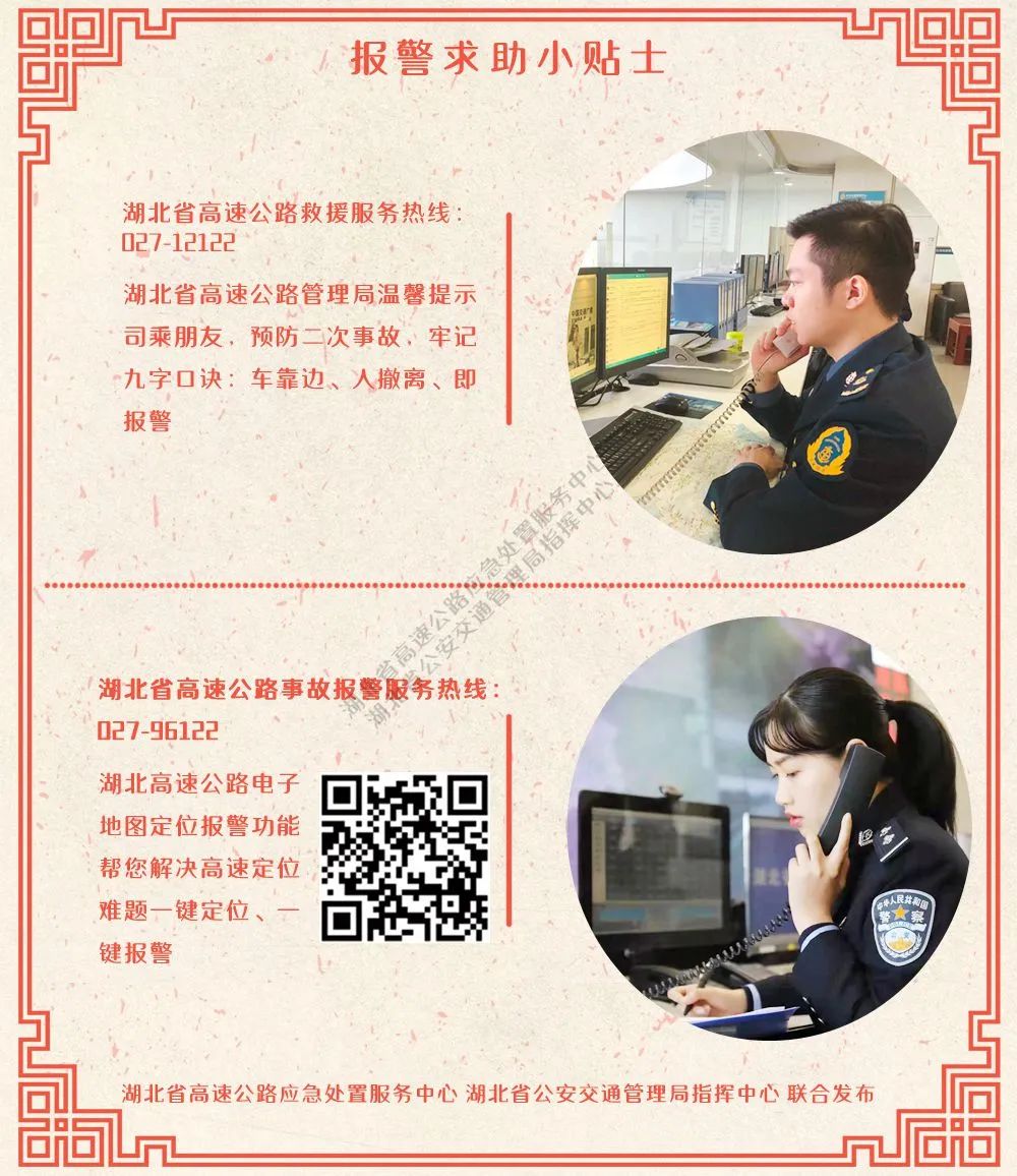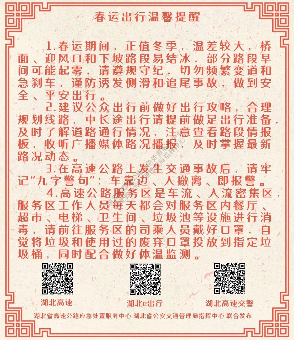 温馨提醒:为科学避开拥堵路段,建议广大公众提前合理安排出行线路,出行途中也可使用各类导航软件,随时关注“湖北高速”“湖北e出行”微信、微博发布的信息,或拨打027-12122湖北高速服务热线,及时收听楚天交通广播FM92.7及微博微信了解路况。