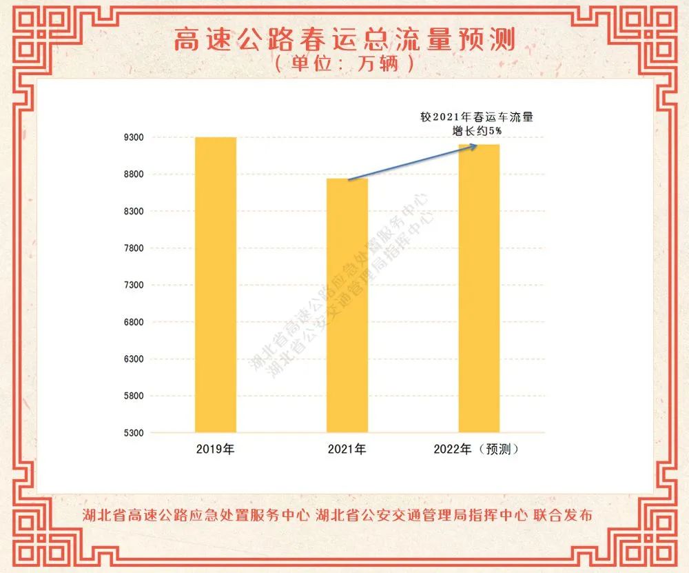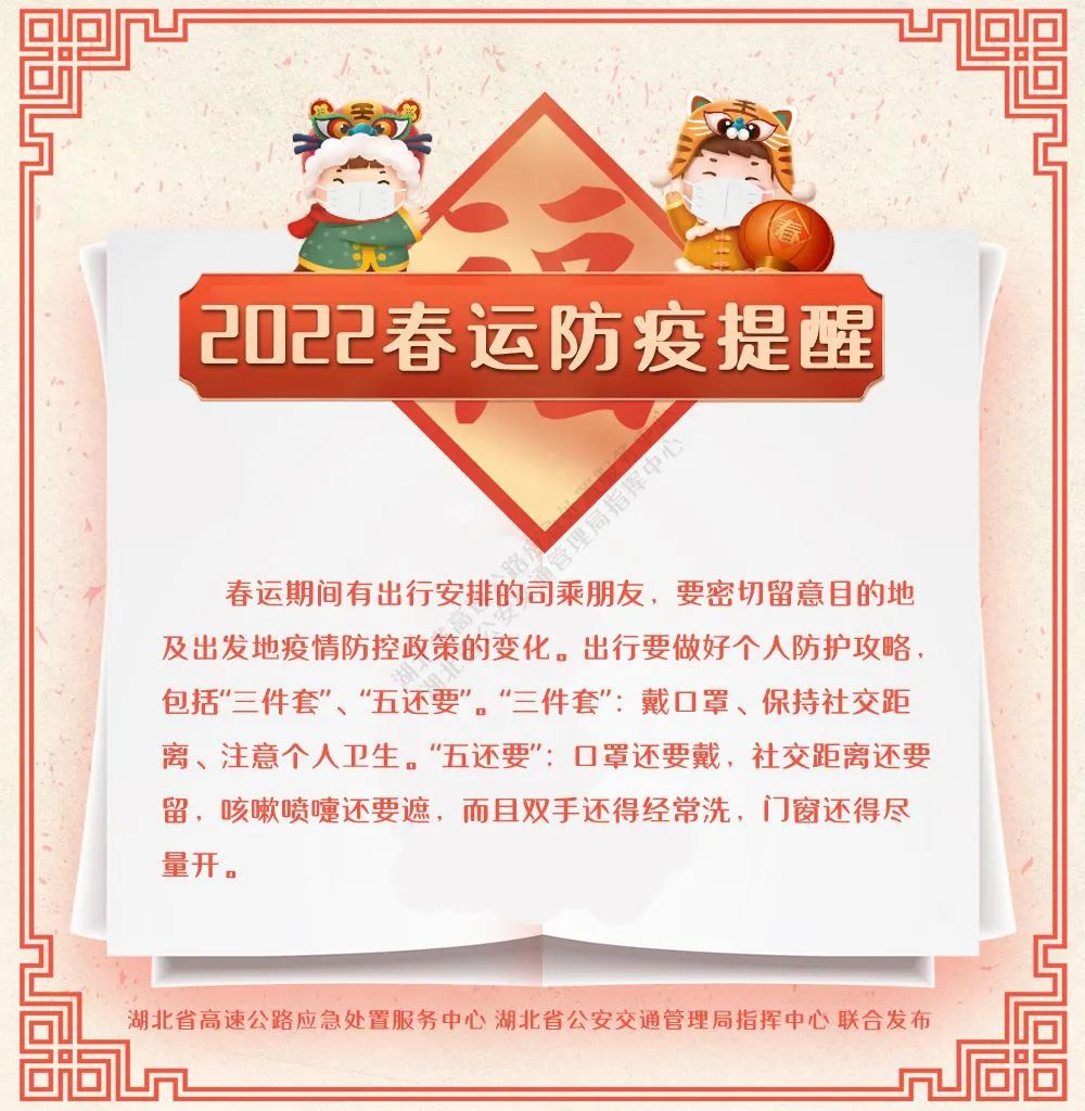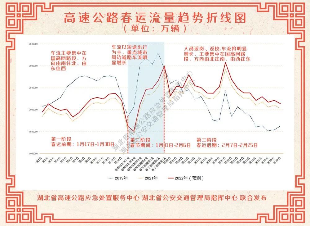 根据湖北省高管局应急处置服务中心对历年来春运期间高速公路路网运行监测分析,结合湖北省疫情防控形势,预计今年春运高速公路出行将呈现春节前车流平稳、节后稳步上升的分化态势。湖北省高管局应急处置服务中心联合湖北省公安交通管理局指挥中心、湖北省气象服务中心,共同编制了《湖北省高速公路2022年春运出行指南》,希望给社会公众春运出行提供指引和帮助。
