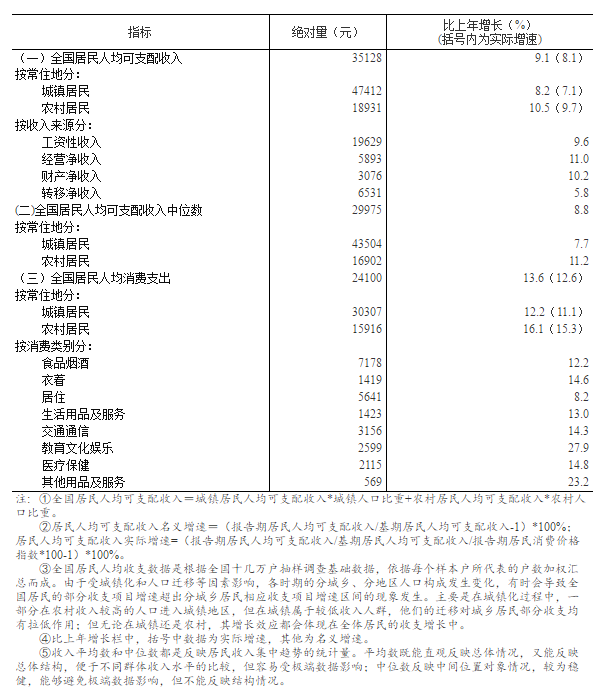 全国及分城乡居民收支数据来源于国家统计局组织实施的住户收支与生活状况调查,按季度发布。