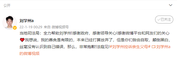 1月19日凌晨,曾发布寻亲视频、在警方协助下与亲生父母相认又再次遭遗弃的河北邢台男生刘学州发文称,“我的善良是有限的,本来已经打算放弃了,但是你们咎由自取,颠倒黑白,丝毫没有认识到自己错误,那么,非常抱歉!法庭见!”疑似决定起诉亲生父母。