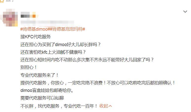 图为“DIMOO联名款盲盒套餐”火爆后,滋生出的“代吃”服务广告。(图片来源于网络)