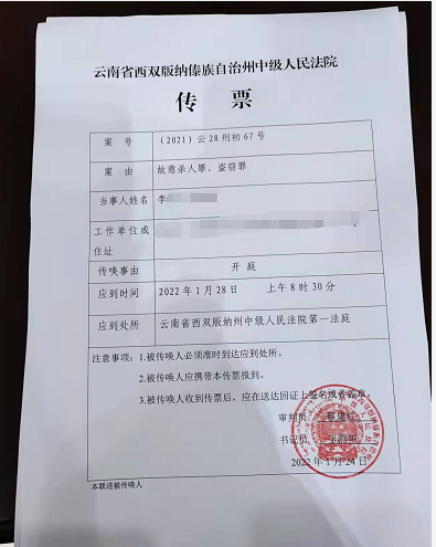 1月24日晚,记者从“南京女大学生遇害案”被害人李某月的父亲李先生处获悉,他收到的法院传票显示,该案件将于1月28日(星期五)8时30分在西双版纳州中级人民法院第一法庭开庭审理。他已到达西双版纳,准备参加庭审。